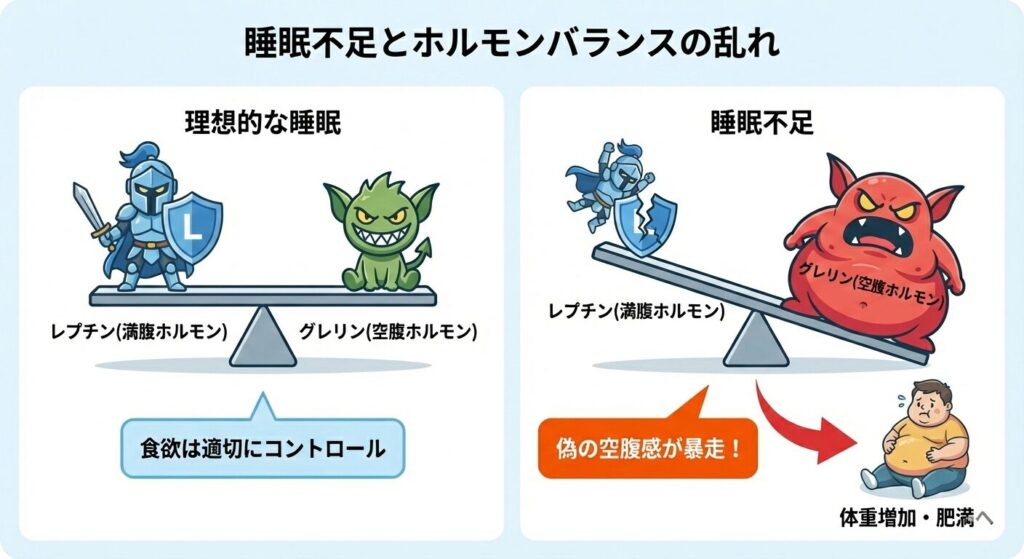 睡眠不足になると、レプチンが減り、グレリンが増える。