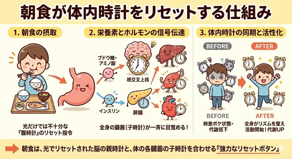 毎朝「日の光+朝食」で体内時計がリセットされることで、自律神経やホルモンのリズムが1日サイクルに合わせ直されます。
